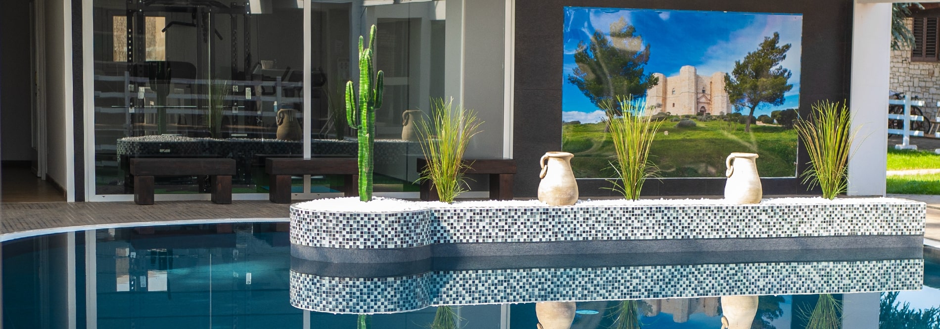 La nostra struttura è dotata di una grande piscina adatta sia per gli adulti che per i più piccoli. L’incantevole piscina è coperta, dalla forma sinuosa, e delimitata da una splendida vetrata trasparente e da erba rigogliosa.