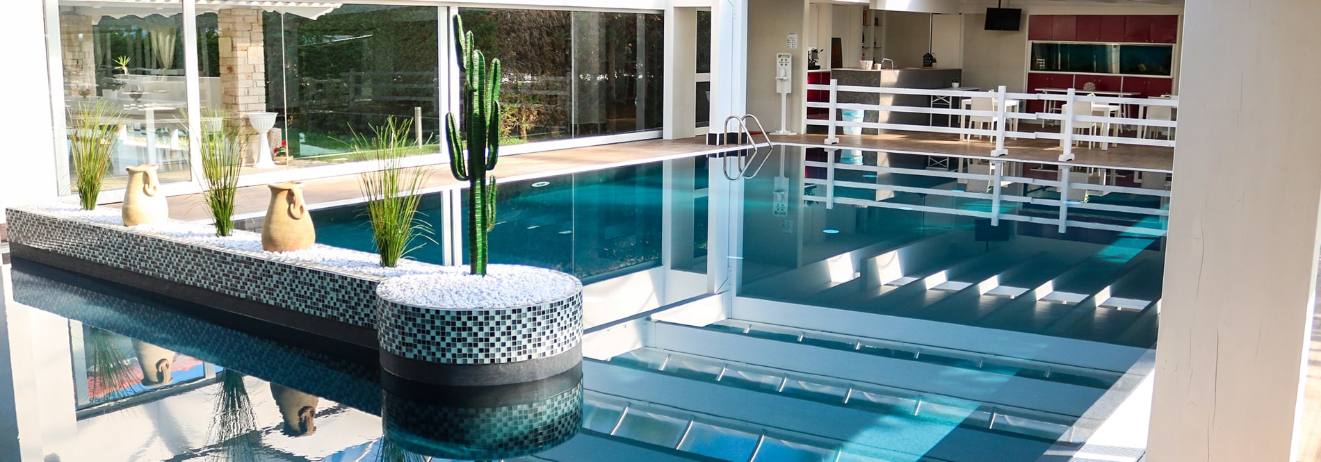 La nostra struttura è dotata di una grande piscina adatta sia per gli adulti che per i più piccoli. L’incantevole piscina è coperta, dalla forma sinuosa, e delimitata da una splendida vetrata trasparente e da erba rigogliosa.